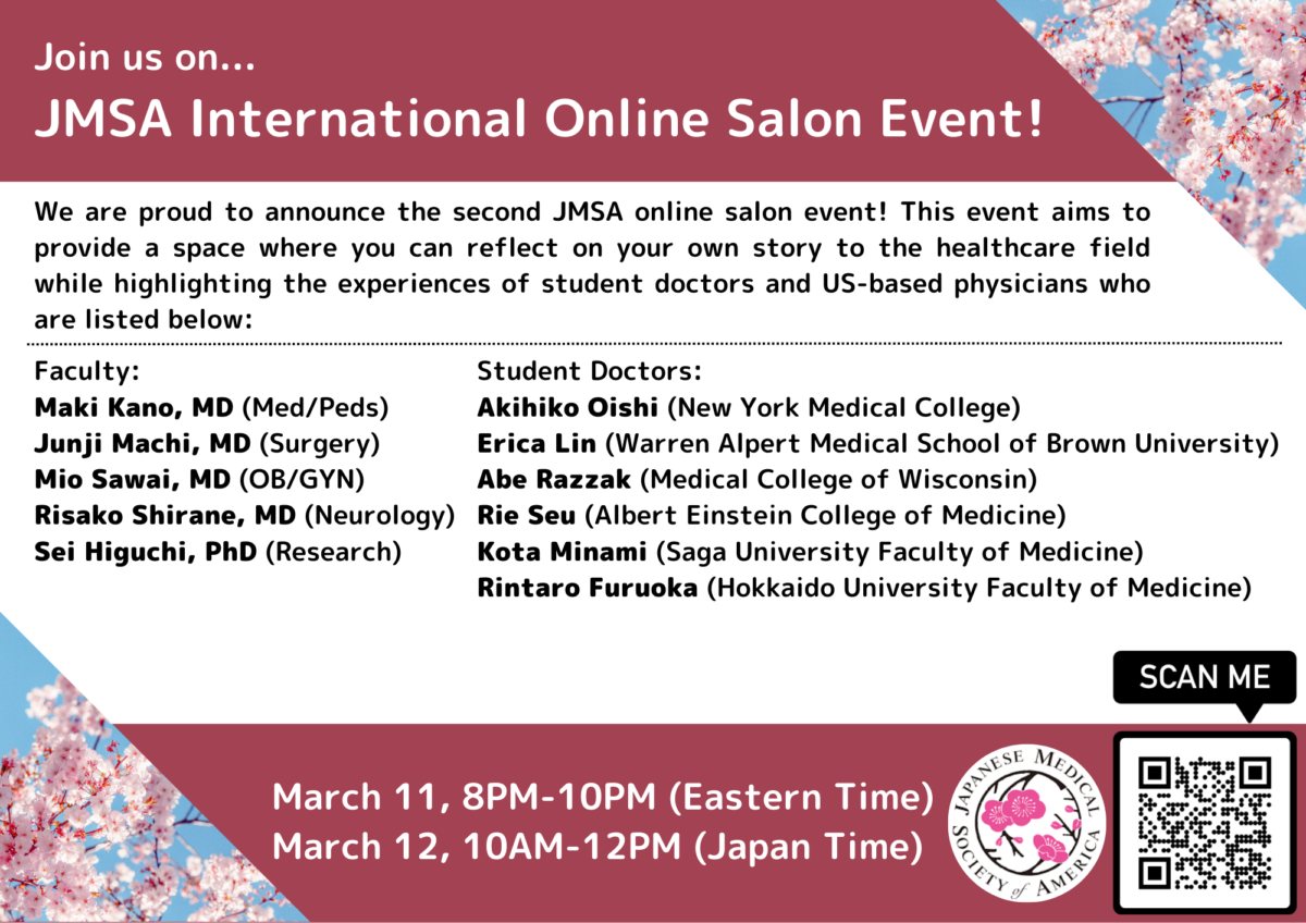 With generous support from attending physicians and student leaders in Japan and the United States, we are proud to announce the JMSA student representative-led online Second International Salon Event planned for March 11 (Eastern Time – US) at 08:00PM and…