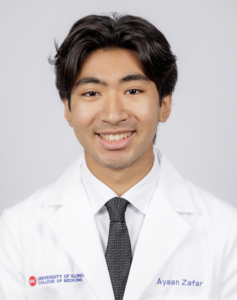Hi everyone, my name is Ayaan Zafar, and I am an M2 at the University of Illinois College of Medicine. I grew up in the northwest suburbs of Chicago, and attended the University of Illinois at Chicago, earning a B.S. in Neuroscience. Before starting medical school, I took a gap year working as a research coordinator at the Brain Plasticity Lab, conducting clinical rehabilitative research for patients with neurodegenerative diseases. In my free time, I enjoy playing tennis, indoor bouldering, and reading.